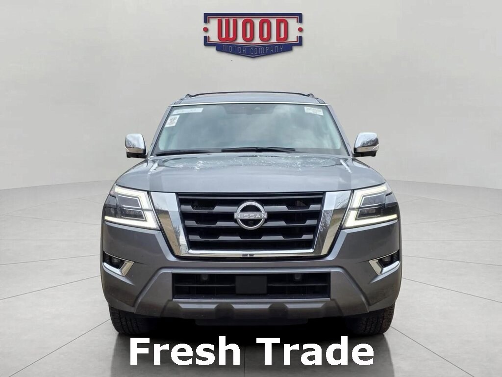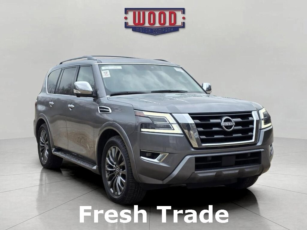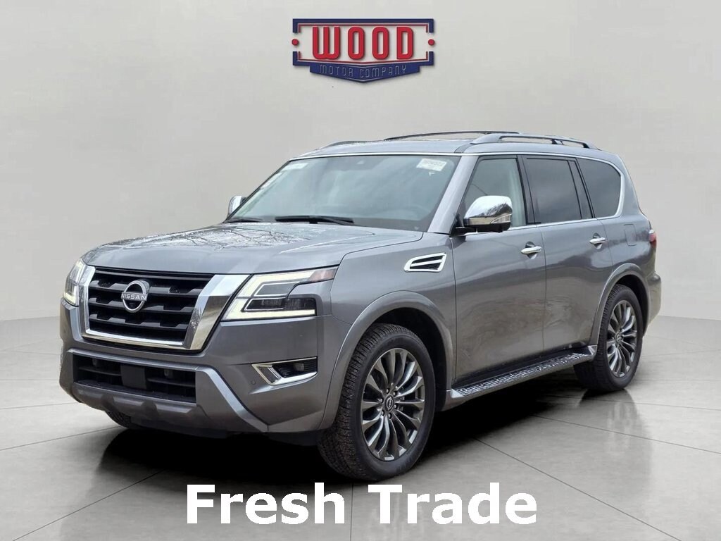 CARFAX One-Owner. Clean CARFAX. Armada Platinum, 4D Sport Utility, 5.6L V8 DOHC 32V LEV3-ULEV125 400hp, 4WD, Gun Metallic, Black w/Quilted Leather Seat Trim, 3rd row seats: split-bench, Automatic temperature control, Electronic Stability Control, Exterior Parking Camera Rear, Front dual zone A/C, Fully automatic headlights, Heated front seats, Heated rear seats, HVAC memory, Memory seat, Navigation System, Outside temperature display, Power driver seat, Power Liftgate, Power moonroof, Power windows, Quilted Leather Seat Trim, Radio: NissanConnect w/SiriusXM, Rear air conditioning, Reclining 3rd row seat, Remote keyless entry, Steering wheel memory, Steering wheel mounted audio controls, Telescoping steering wheel, Tilt steering wheel, Traction control, Ventilated front seats. Gun Metallic 2024 Nissan Armada Platinum 4WD 7-Speed Automatic 5.6L V8 DOHC 32V LEV3-ULEV125 400hpA solid name you can trust... Wood Motor. Recent Arrival! Odometer is 717 miles below market average!